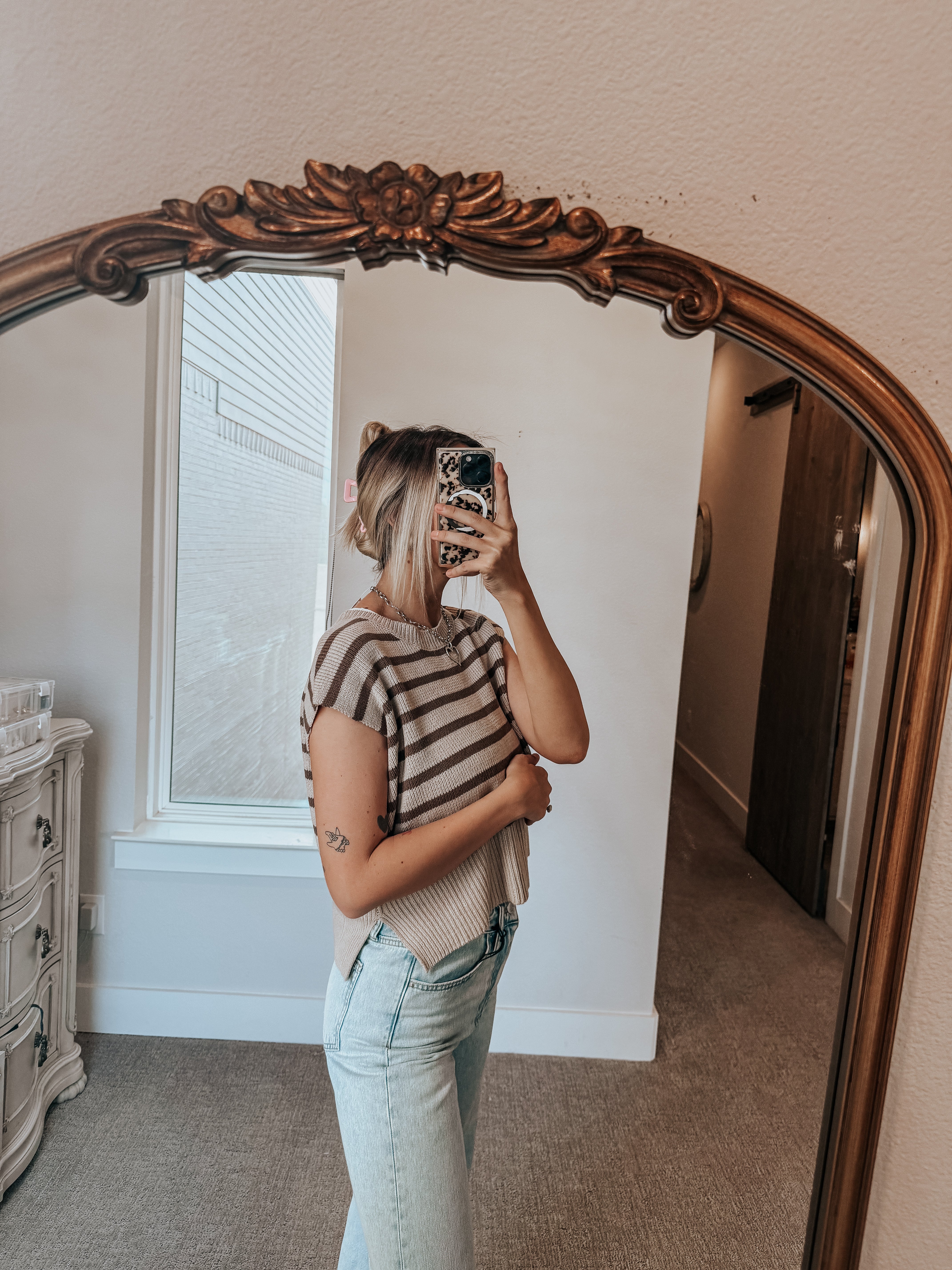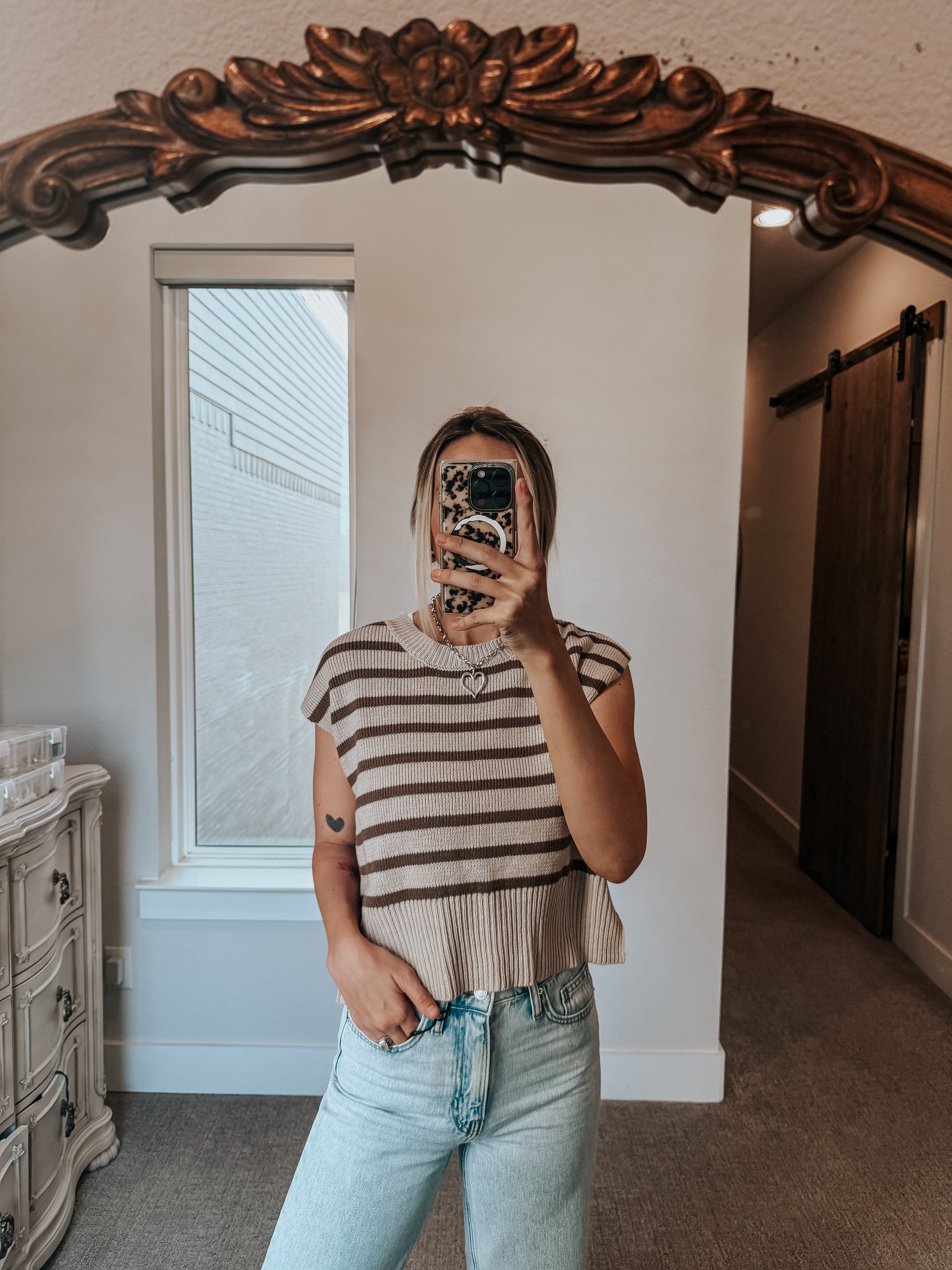 This striped cap sleeve sweater top is the definition of effortless style. Crafted from a soft knit fabric, it features a relaxed, boxy silhouette that drapes beautifully without feeling oversized. The classic crew neckline and wide ribbed hem add structure, while cap sleeves and subtle side slits keep the look casual, comfortable, and easy to wear.